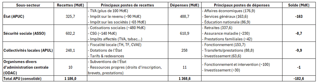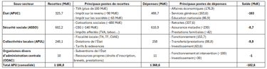 Rappelons que le budget consolidé de l'état, ou comptes des administrations publiques (APU), est d'environ 1400 milliards d'euros. Il regroupe 4 sous-secteurs :